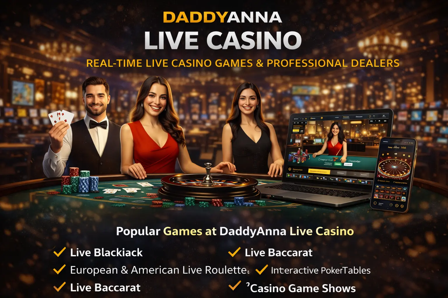 DaddyAnna Live Casino offers live blackjack, roulette, baccarat, poker-style games, and interactive casino shows with real-time dealer interaction.